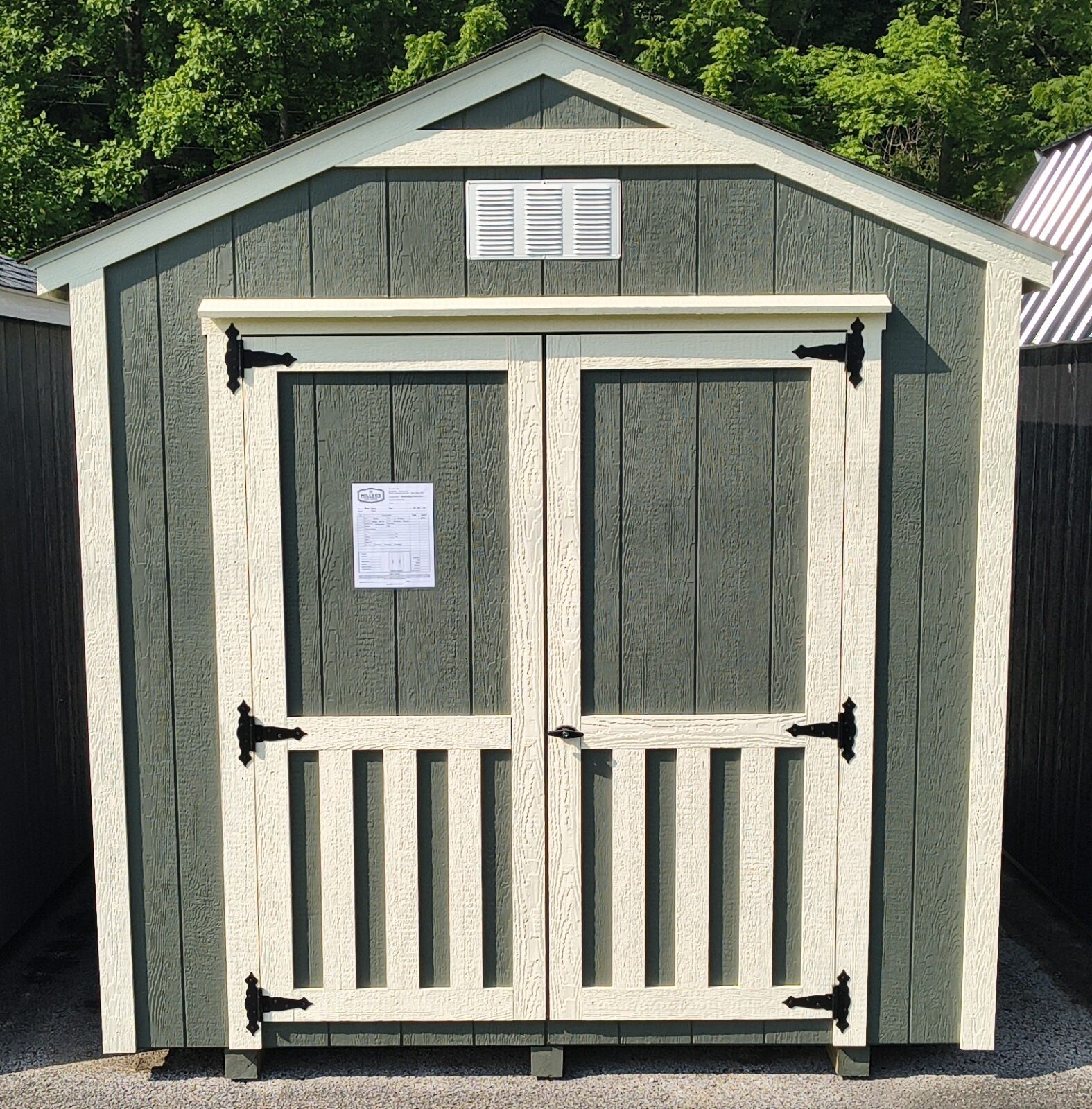 The 8 x 10 A-Frame Shed is the perfect addition to your backyard with its Avocado Green siding, Navajo White trim, and Driftwood shingle roof. This charming shed is not only practical for storing all your outdoor equipment, but it also adds a touch of style to your outdoor space.