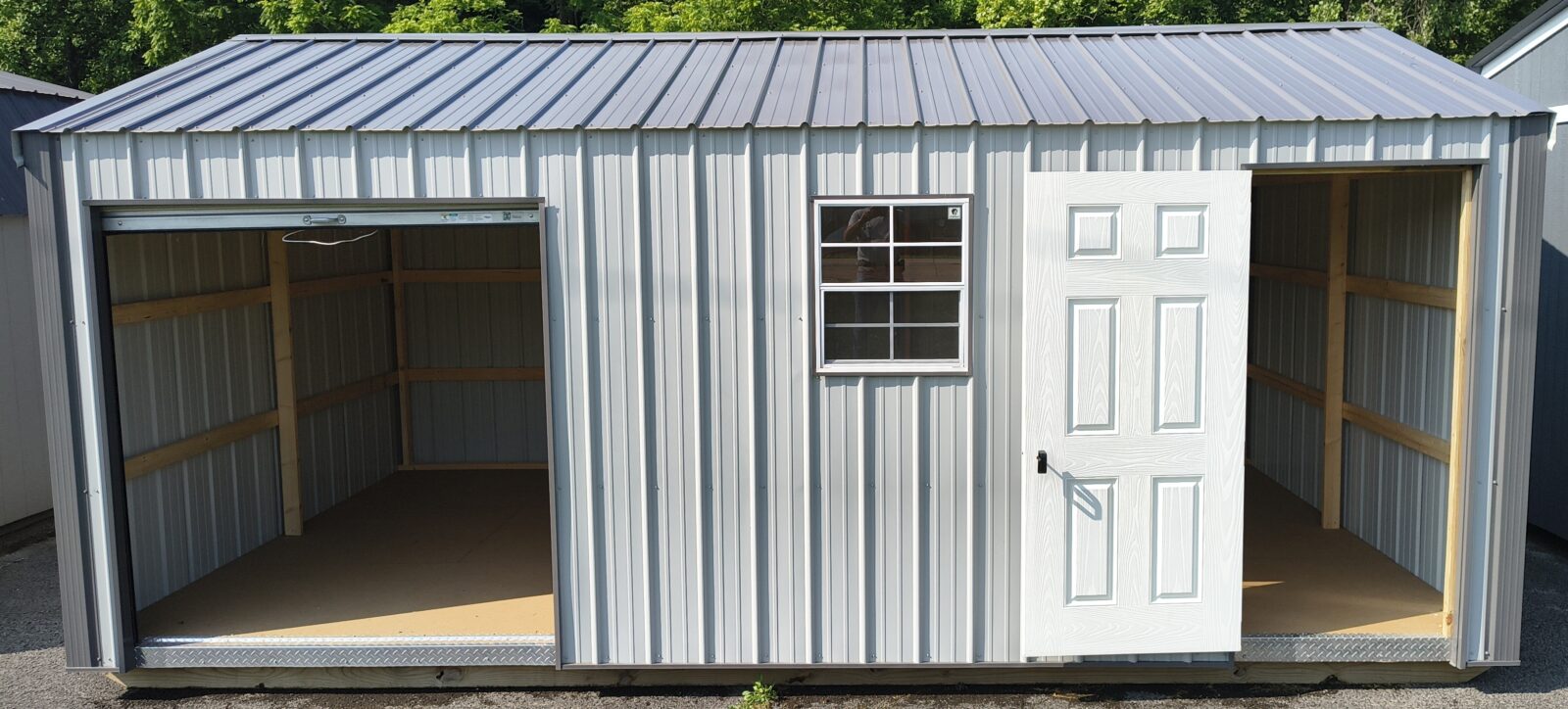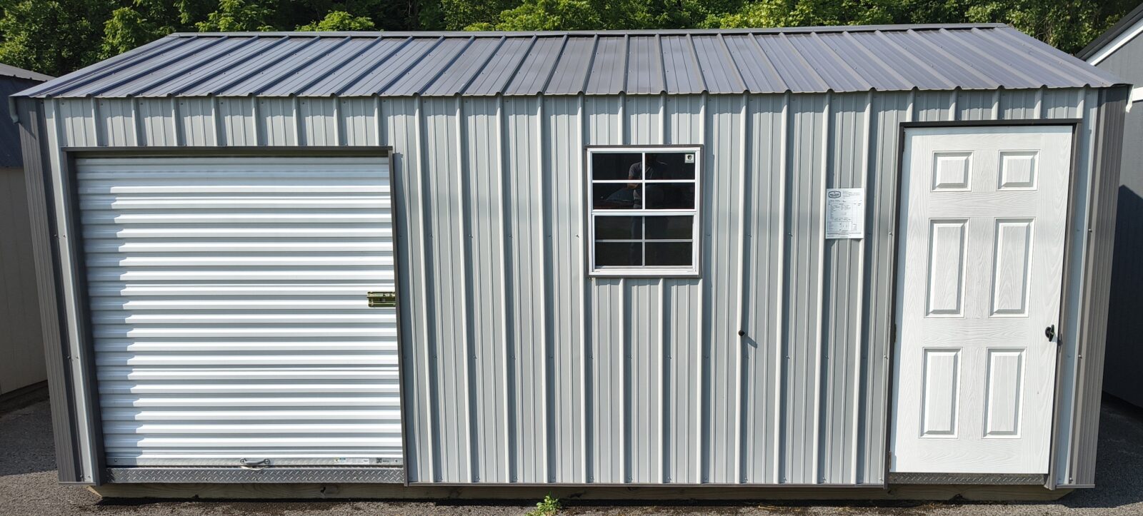 Introducing our 12 x 20 His & Hers Shed, a stylish and functional storage solution for you and your partner! Made with durable gray siding, charcoal trim, and a sleek metal roof, this shed is not only sturdy, but also visually appealing. The shed features one 24 x 27 window to let in natural light, a convenient 6′ roll-up door for easy access, and a sturdy entry door. Whether you’re storing tools, gardening equipment, or outdoor gear, this shed has you covered!
